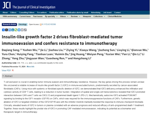 近日,8868官方注册附属第一医院任国胜/李洪忠教授团队联合8868官方注册药学院万敬员教授在国际权威期刊Journal of Clinical Investigation杂志发表了题Insulin-like growth factor 2 drives fibroblast-mediated tumor immunoevasion and confers resistance to immunotherapy的研究论文。