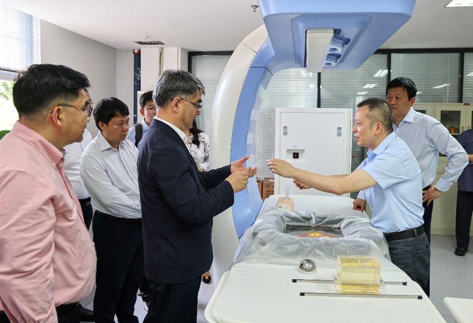 郑忠伟一行参观了省部共建超声医学工程国家重点实验室,现场观摩聚焦超声消融手术模拟操作演示,实验室副主任李发琪汇报了实验室建设进展、聚焦超声技术原理、国家自然科学基金委重大科研仪器项目研究进展及该技术在临床治疗和社会应用方面的成效。