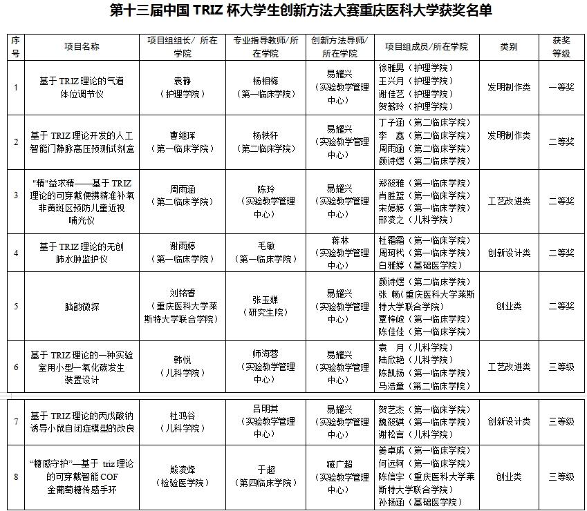 我校基于“8868官方注册-市级-国家级”三级大学生创新创业训练计划,深度融入TRIZ理论,鼓励学生运用TRIZ解决临床实际问题。依托生物医学创新创业实践基地,配备“TRIZ导师+专业导师”的双导师团队,搭建师生对接平台,通过TRIZ理论培训和项目打磨筛选出优质医学创新项目。在前期校赛阶段共有30个团队成功报名,经决赛答辩25个团队脱颖而出,推荐进入市赛;在重庆市比赛中,我校共获得特等奖2项、一等奖5项、1项二等奖,三等奖7项,位居市内高校前列。其中获得二等奖以上的8个项目获推进入国赛,经国赛决赛网评,3项获评为三等奖,5项进入现场总决赛争夺一、二等奖。在现场总决赛的赛场上,我校5支团队的代表讲解自信流畅,答辩沉着冷静,充分展示了我校学子的双创风采和“TRIZ+医学”的融合优势,圆满完成总决赛比赛任务,取得优异成绩。