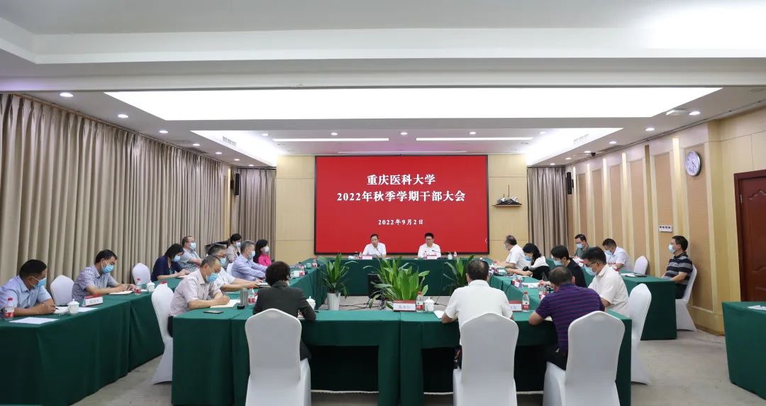 全体在家校领导,各附属医院、二级学院、党政职能部门副处级以上干部参加会议。