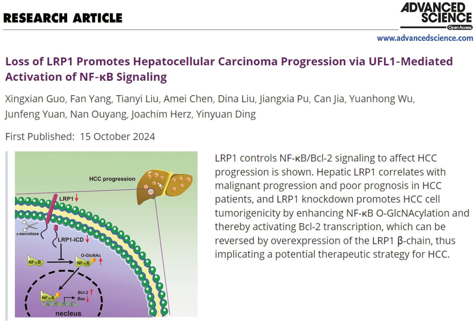 10月15日,我校脂质研究中心丁银元特聘教授团队在国际知名期刊《Advanced Science》(中科院一区TOP期刊)在线发表了题为“Loss of LRP1 Promotes Hepatocellular Carcinoma Progression via UFL1-Mediated Activation of NF-kB Signaling”的最新研究成果。该研究解析了低密度脂蛋白受体相关蛋白1(LRP1)在原发性肝癌(HCC)疾病发生和发展中的作用及其分子机制。