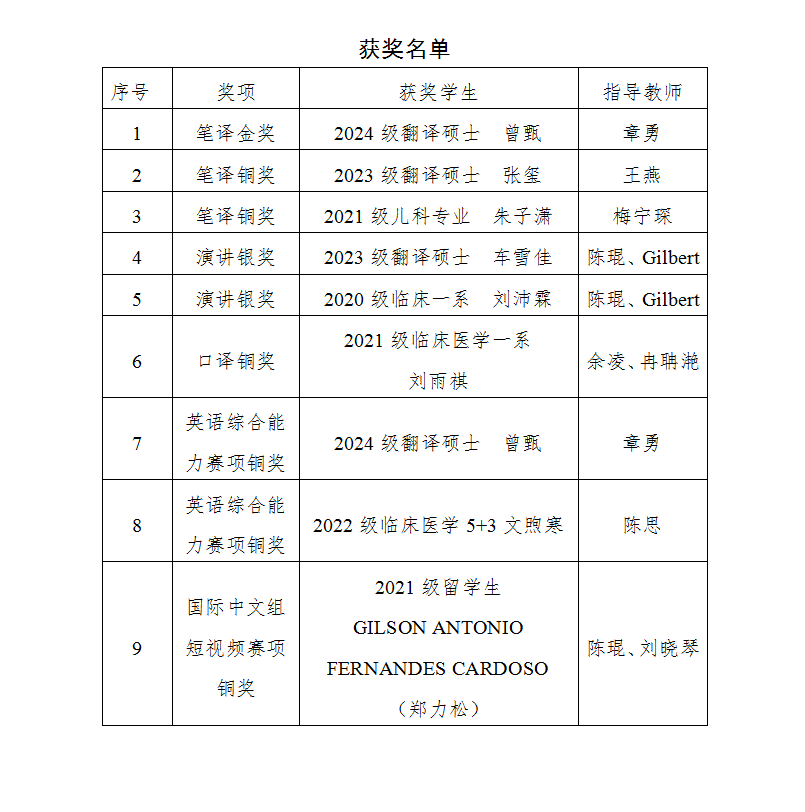 市赛阶段,重庆赛区汇集了市内28所高校、9个外语语种的552名选手,我校来自翻译、儿科、临床医学等专业共计11位选手进入决赛,分别参与英语综合能力、演讲、笔译、口译以及国际中文短视频大赛五个赛道的比拼。经过激烈角逐,我校共9名学生获奖,2024级翻译硕士曾甄荣获笔译金奖,并成功入围国赛;2023级翻译硕士张玺、2021级儿科专业朱子潇获笔译铜奖;2023级翻译硕士车雪佳、2020级临床一系刘沛霖获演讲银奖;2021级临床医学一系刘雨祺获口译铜奖;2024级翻译硕士曾甄、2022级临床医学5+3文煦寒获英语综合能力赛项铜奖;2021级留学生GILSON ANTONIO FERNANDES CARDOSO获国际中文组短视频赛项铜奖。