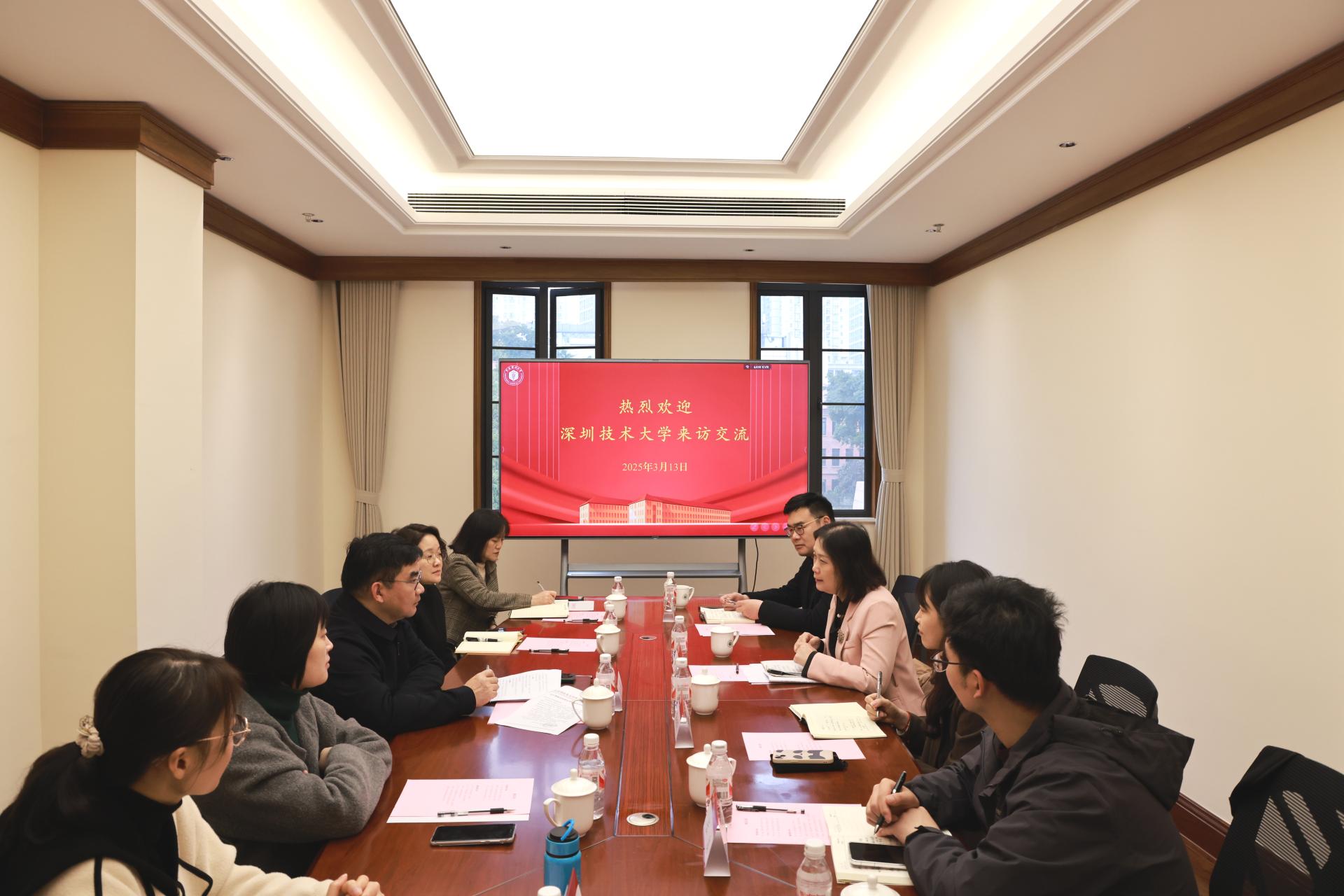 许媛感谢我校的热情接待,对我校在综合考核方案制定实施、干部选任监督等方面的工作给予高度评价。她介绍了深圳技术大学的发展历程和建设情况,并分享相关经验做法。她表示,希望两校继续开展互访交流,在党建工作、学科专业建设、产教融合等领域加强学习互鉴,共同推动事业发展取得进步。随后,双方围绕AI赋能干部监督管理和考核方案制定等主题深入交流讨论。
