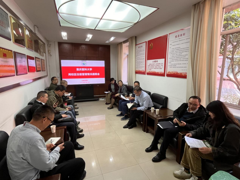 王栋介绍了会议背景、我校住宿管理的特点、难点以及解决的思路和举措。后勤管理处副处长张绍群简要汇报了袁家岗校区西苑5号楼即将恢复为学生宿舍前相关部门联合勘查情况、国际医学院的住宿需求报告及相关建议。学生社区管理科科长杨成顺汇报了两校区学生住宿管理现状和存在的问题。相关部门参会人员就如何协同做好学生宿舍住宿管理的相关工作积极建言献策。