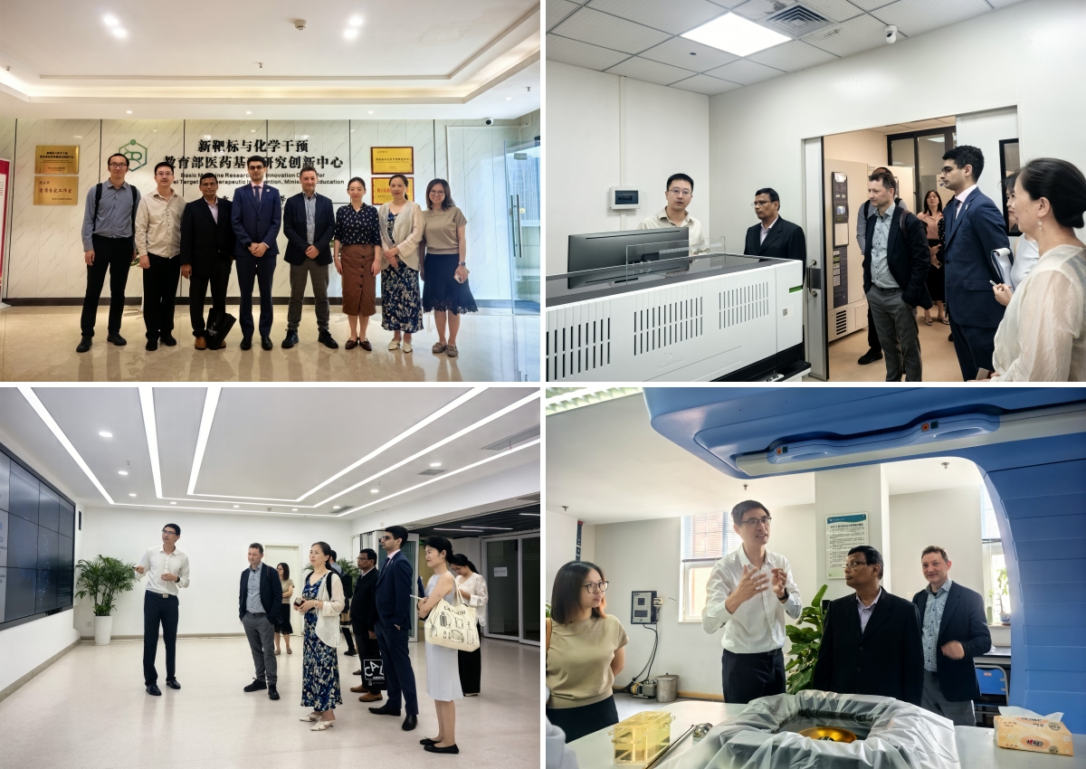 代表团一行参观了8868官方注册新靶标与化学干预教育部医药基础研究创新中心和超声医学工程国家重点实验室,谌錾教授和周宇峰教授分别向代表团介绍了中心概况及科研方向和我校原创技术及产学研用发展情况。