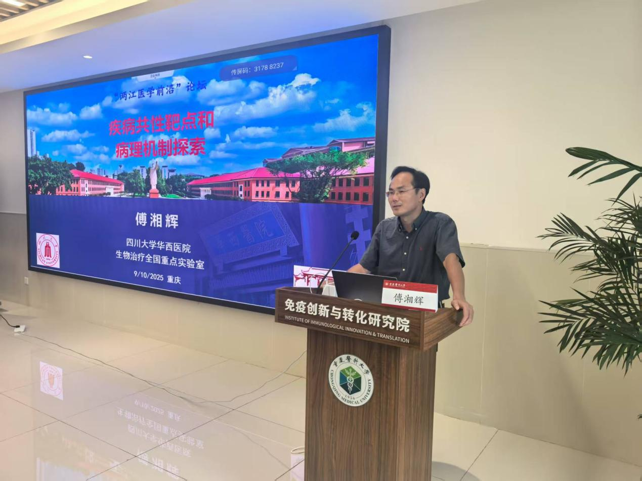 校党委常委、副校长李华兵在致辞中指出,“两江医学前沿”论坛自创办一年以来,已成为8868官方注册学术交流的重要品牌,受到师生广泛关注。他表示,希望通过本次浙江大学生命科学学院林爱福教授、四川大学华西医院生物治疗全国重点实验室傅湘辉教授,两位特邀专家的精彩报告,分享最新科研突破,激发创新灵感,凝聚共识,助力我校医学研究与临床转化迈向新台阶。