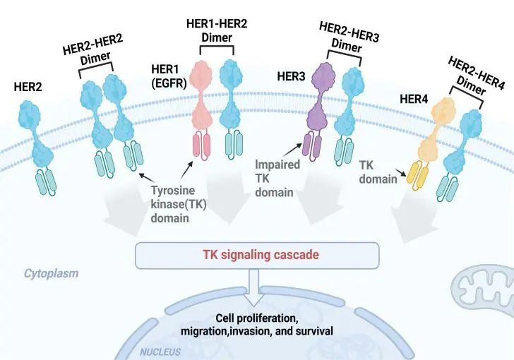 细胞表面蛋白异常高表达和寡聚化是肿瘤发生的关键驱动事件,目前上市的靶向药物超过60%以细胞表面蛋白为靶点。因此,筛选和鉴定肿瘤细胞表面蛋白寡聚化分型标志物对肿瘤精准靶向治疗具有重要价值。大量研究显示,HER2二聚体是全新的HER2阳性肿瘤分子分型标志物,然而临床常规使用免疫组化检测HER2蛋白表达量,筛选HER2阳性患者用药,难以满足更精准的抗HER2靶向治疗需求。