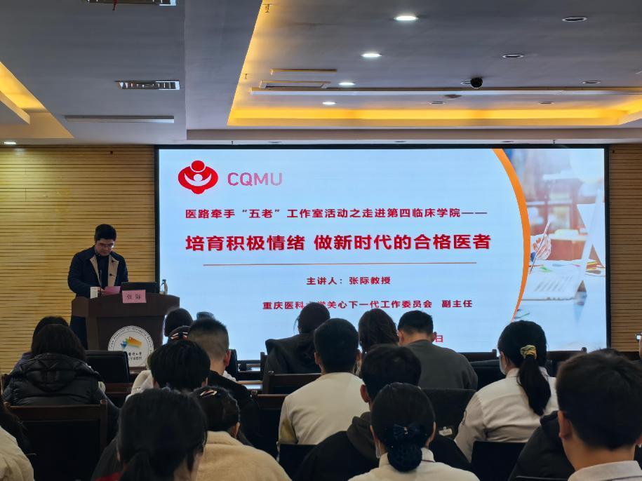 11月28日下午,第四临床学院携手 “五老” 工作室,在门诊五楼多媒体会议室举办了一场“培育积极情绪 做新时代的合格医者”的主题讲座。会议由党委委员、副院长唐博主持,学院各党支部和团支部委员及在院研究生、规培生、实习生共100余人参加了本次讲座。