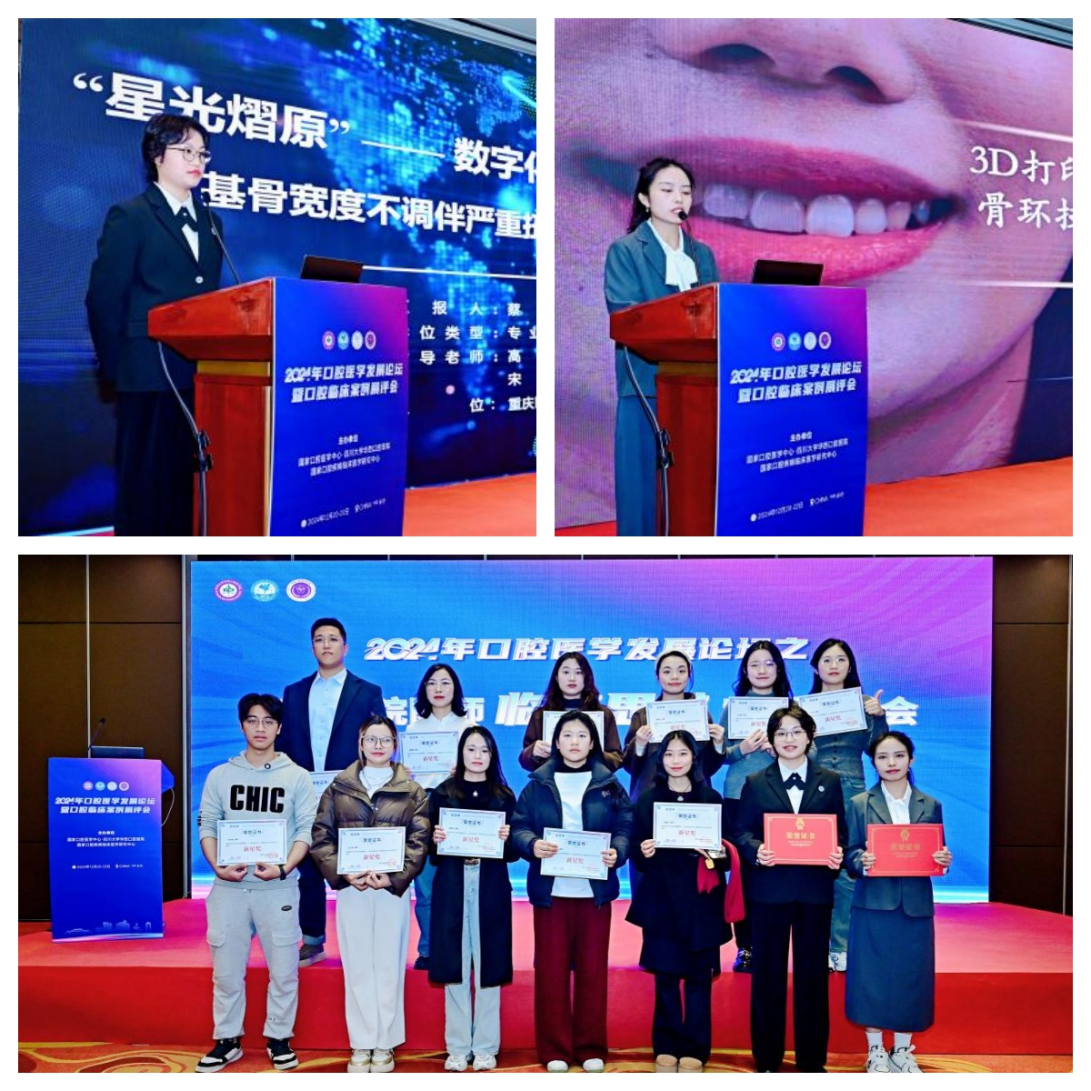 口腔正畸科口腔医学硕士专业学位研究生蔡文嘉参加“星光熠原—技术赋能促推广”板块现场交流,作题为《数字化技术辅助儿童早期矫治—基骨宽度不调伴严重扭转牙的非拔牙矫治一例》的汇报,荣获“最佳展示奖”。口腔修复科口腔医学硕士专业学位研究生杨敏雪在“拨云见日—疑难病例重思辨”板块,作题为《3D打印个性化钛网联合自体骨环技术行美学区复合缺损种植修复一例》的汇报,荣获“最佳案例奖”。
