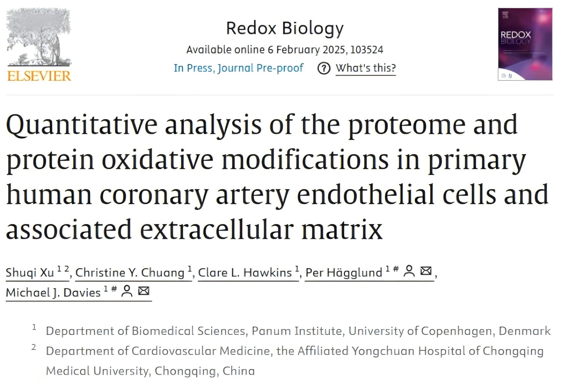 近日,附属永川医院副研究员、师资博士后许树奇的研究论文“Quantitative analysis of the proteome and protein oxidative modifications in primary human coronary artery endothelial cells and associated extracellular matrix”(《原代人源冠状动脉内皮细胞及其细胞外基质蛋白质组与蛋白氧化修饰的定量分析》)在国际著名生物医学类期刊《Redox Biology》上发表,该期刊为中国科学院1区顶刊。