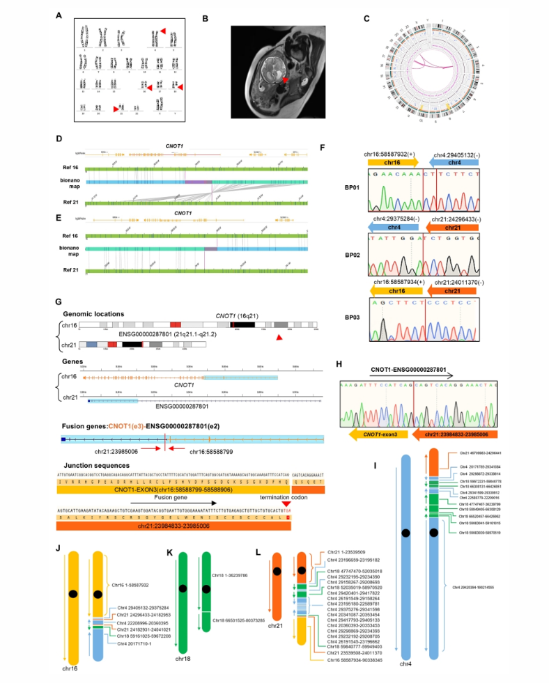 一名28岁孕妇在孕24周超声提示胎儿脑室扩大(左室15mm,右室12mm),经核型分析初步判定为多条染色体复杂重排,而染色体芯片未发现拷贝数异常。附属第二医院产前诊断中心分子检测平台迅速启动多技术联合检测,OGM技术全局扫描,锁定4条染色体间发现几十处复杂断裂点;ONT长读长测序精细解析断裂区序列,发现CNOT1基因外显子1-3与21号染色体异常连接;RNA测序证实融合基因导致蛋白翻译提前终止,致病机制明确;溯源分析确认异常染色体来源于父系,为遗传咨询提供关键信息。
