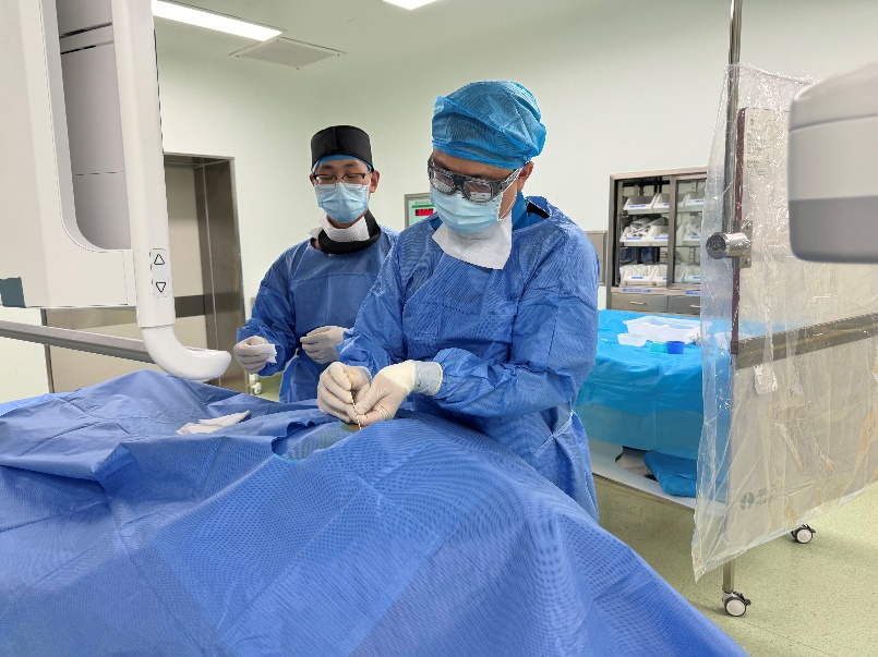 近日,一位67岁的女性患者于外院行颅内动脉瘤开颅夹闭术,术后一月余患者仍处于昏迷状态,为进一步诊治,到附属巴南医院神经外科就诊。入院后经多疗程高压氧、康复等治疗后意识仍未恢复。神经外科团队完善颅脑MR、脑电图、CRS-R评分等术前评估,决定为其实施穿刺式高颈段脊髓电刺激系统植入术。手术由神经外科曾实主任医师在DSA透视引导下,通过内置导丝将电极远端植入近颈2椎体棘突水平,手术过程顺利,术后即刻测试电极工作正常,患者目前正在刺激促醒中。