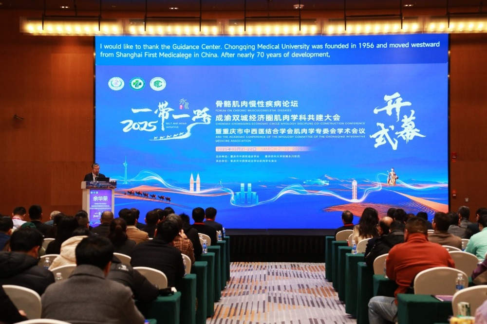 3月22日,由重庆市中西医结合学会、附属永川医院主办的2025“一带一路”骨骼肌肉慢性疾病论坛在永川举行。本次论坛以“‘一带一路’连中外·成渝肌骨创未来”为主题,汇聚了美国、埃及、保加利亚、巴基斯坦、伊朗等国家和国内各地区共220余位专家学者,围绕骨骼肌肉慢性疾病的前沿技术、中西医结合创新及共建“一带一路”医疗合作展开深度对话,为全球骨骼肌肉健康贡献智慧方案。附属永川医院副院长周昌龙主持开幕式。