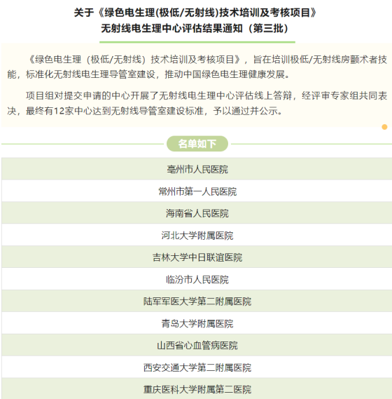 近日,中国生物医学工程学会心律分会(CHRS)绿色电生理技术培训及考核项目组发布了全国第三批《绿色电生理(极低/无射线)技术培训及考核项目》无射线电生理中心评估结果通知。附属第二医院心血管内科获批全国第三批、重庆首批绿导电生理中心认证;同时该科凌智瑜主任团队中5名专家获评重庆市首批“无射线房颤术者”资质。这一成果标志着附属第二医院在心律失常介入治疗领域迈入“绿色精准”新阶段,为山城患者带来更安全、更高效的健康保障。