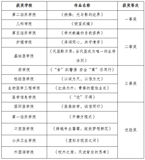 生物医学工程学院选送情景剧《红线内外:青春的理性生长》通过动情演绎同学之间的冲突化解,赢得了现场观众的阵阵掌声;第二临床学院选送歌剧《抉择:光与影的边界》,则以歌舞形式生动号召同学们以实践筑牢学术脊梁,以行动书写诚信篇章;公共卫生学院选送的情景剧《虚拟与现实》以网游为切入点,敲响沉溺网络的警钟;基础医学院原创情景剧《代签默示录:当代签成为唯一的生存法则》,剖开蔑视规则的沉重代价。国际医学院校园情景剧《医路助学,诚信同行》传递了“励志·感恩·诚信”的国家资助政策;医学信息学院作品《“优”不得》则以鲜活案例,揭示走捷径背后的沉痛教训。