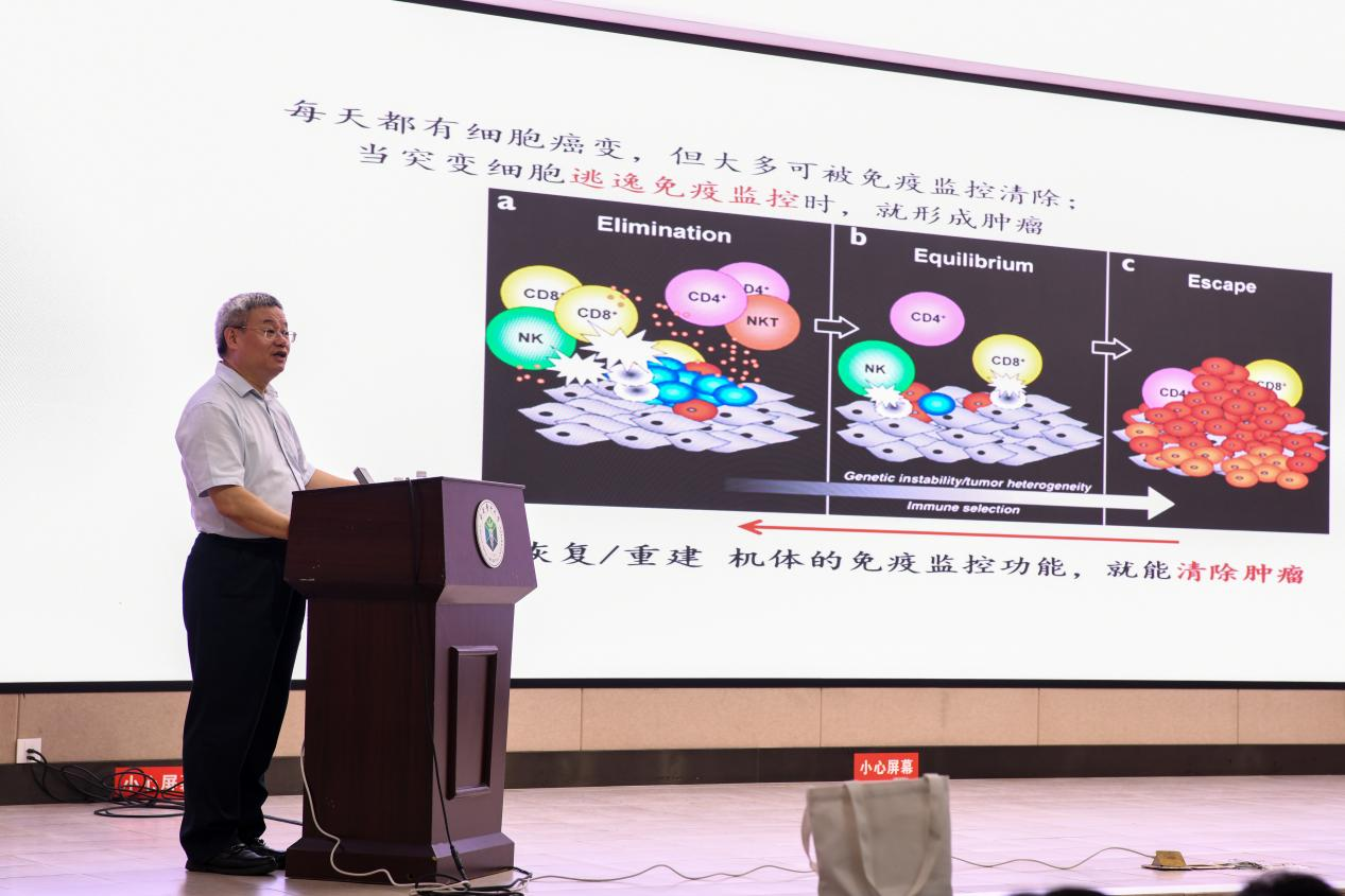 郑利民结合自身肿瘤免疫领域的研究,从肿瘤改变免疫细胞表型的机制研究到肿瘤免疫调控新机制,他用深入浅出的讲述带领师生们一同探寻学科前沿。他以“如何做科研破题”分享科研心得,他指出在科学研究的道路上,要细致观察、多多尝试、大胆设想、小心求证,青年科技工作者要善于带团队,充分把握好团队成员培养的梯队,要有激励机制,更好调动大家的积极性和创造性。郑利民还结合了自身求学、工作经历为同学们分享人生感悟:从上海第一医学院求学再到华山医院工作,从瑞典读博深造,再到回国投身科学研究,郑利民一路坚持不懈,不断擦亮人生底色。他勉励同学们要抓住锻炼机会,学会合作共赢,在实现中华民族伟大复兴中国梦的新时代,敢于直面机遇与挑战,勇担使命和责任。