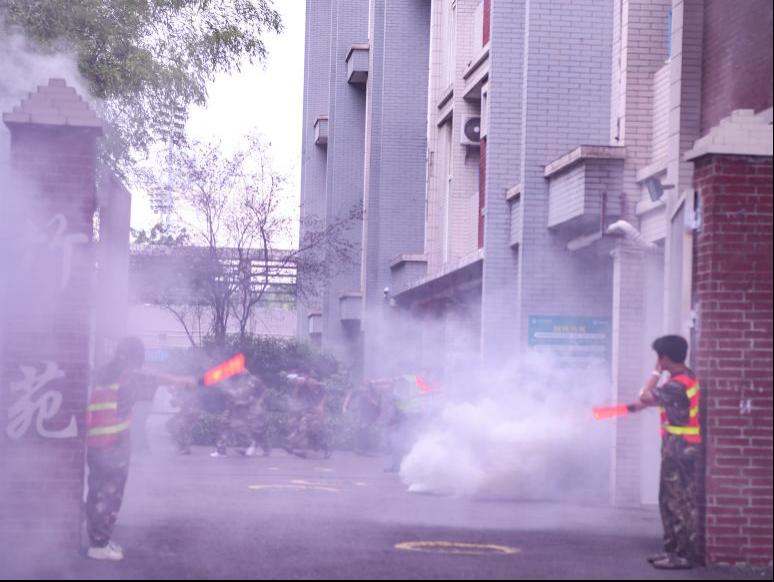 在应急疏散演练模拟火情场景中,警报响起,各楼栋引导人员迅速就位,组织新生用湿毛巾捂住口鼻、弯腰低姿,按预定路线有序撤离。整个过程紧张高效,新生在短时间内全部安全到达指定区域。