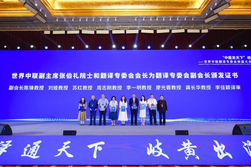 会上举行了世界中联翻译专委会新一届领导班子证书颁发仪式。张伯礼为翻译专委会副会长颁发证书。