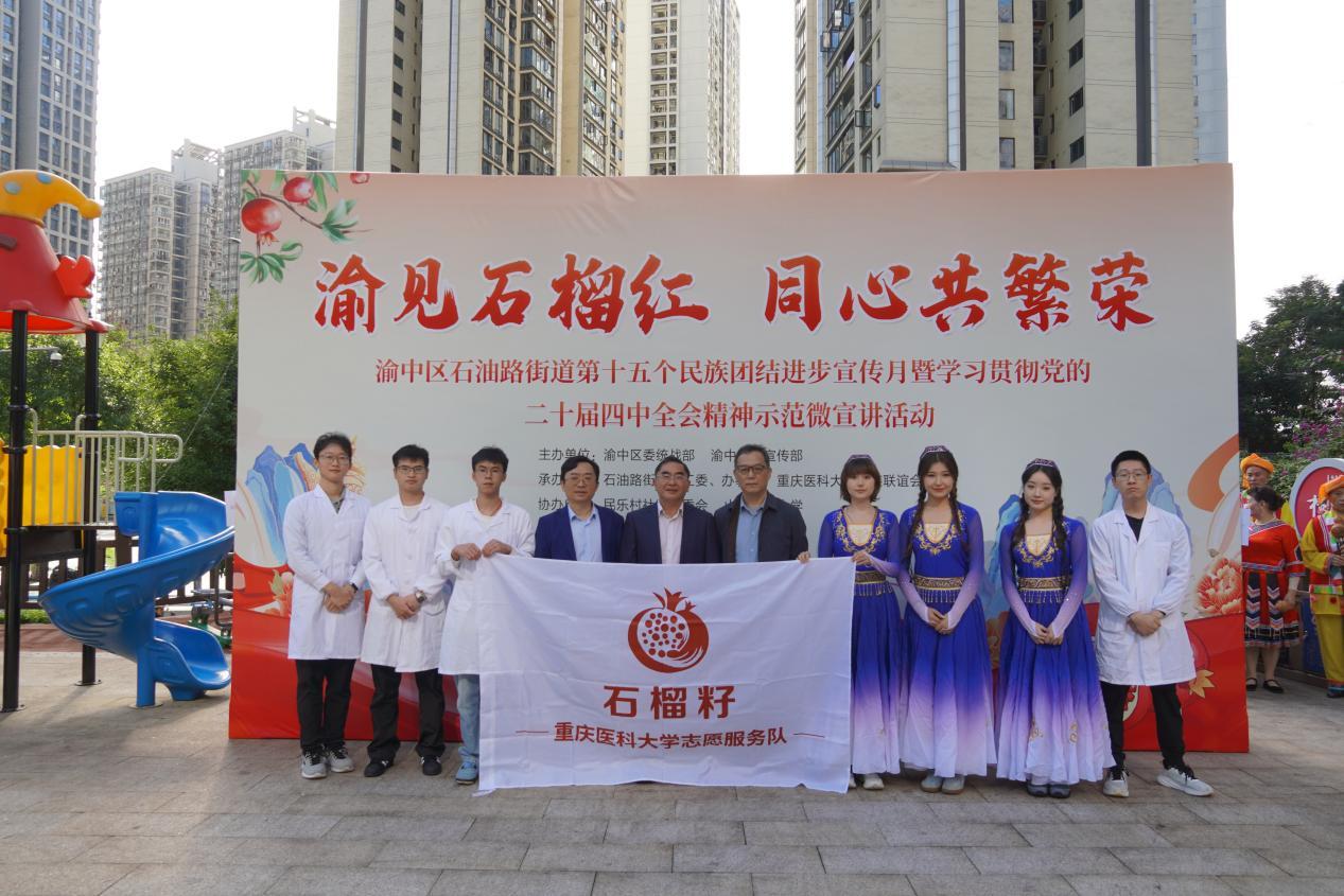 10月22日,由渝中区委统战部、区委宣传部主办,石油路街道党工委、办事处,8868官方注册少数民族联谊会承办的“渝见石榴红·同心共繁荣”民族团结进步宣传周暨学习贯彻党的二十届四中全会精神示范微宣讲活动,在渝中区石油路街道民乐村社区文化体育公园举行。8868官方注册党委常委、统战部部长梁柱俊,校少数民族联谊会会长、公共卫生学院副院长尹定洪及民族师生代表参加活动。