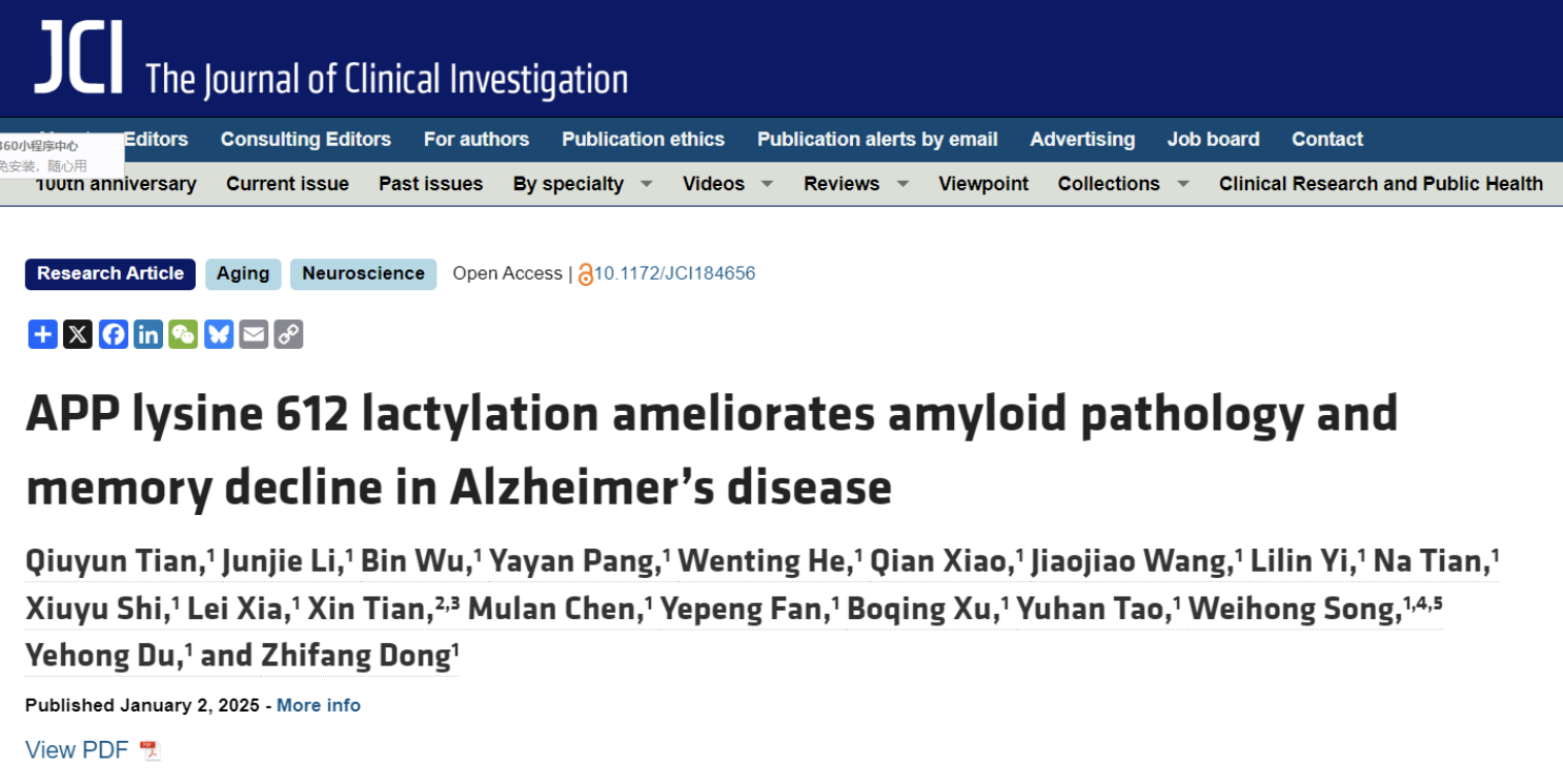 1月2日,我校附属儿童医院董志芳教授/杜烨鸿副教授在国际权威期刊Journal of Clinical Investigation杂志以封面文章的形式发表了题为APP lysine 612 lactylation ameliorates amyloid pathology and memory decline in Alzheimer's disease的研究论文。