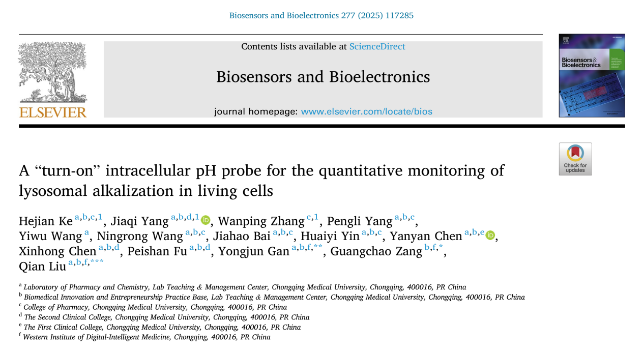 近日,我校本科生柯何键(2022级药学专业)、杨佳琪(2021级临床医学专业)等学生团队在实验教学管理中心教师团队的指导下,成功开发出一种“Turn-on”荧光探针B26,实现了活细胞内溶酶体碱化过程的精准定量监测。该研究成果以A “turn-on” intracellular pH probe for the quantitative monitoring of lysosomal alkalization in living cells为题,在线发表于中科院一区期刊Biosensors and Bioelectronics。