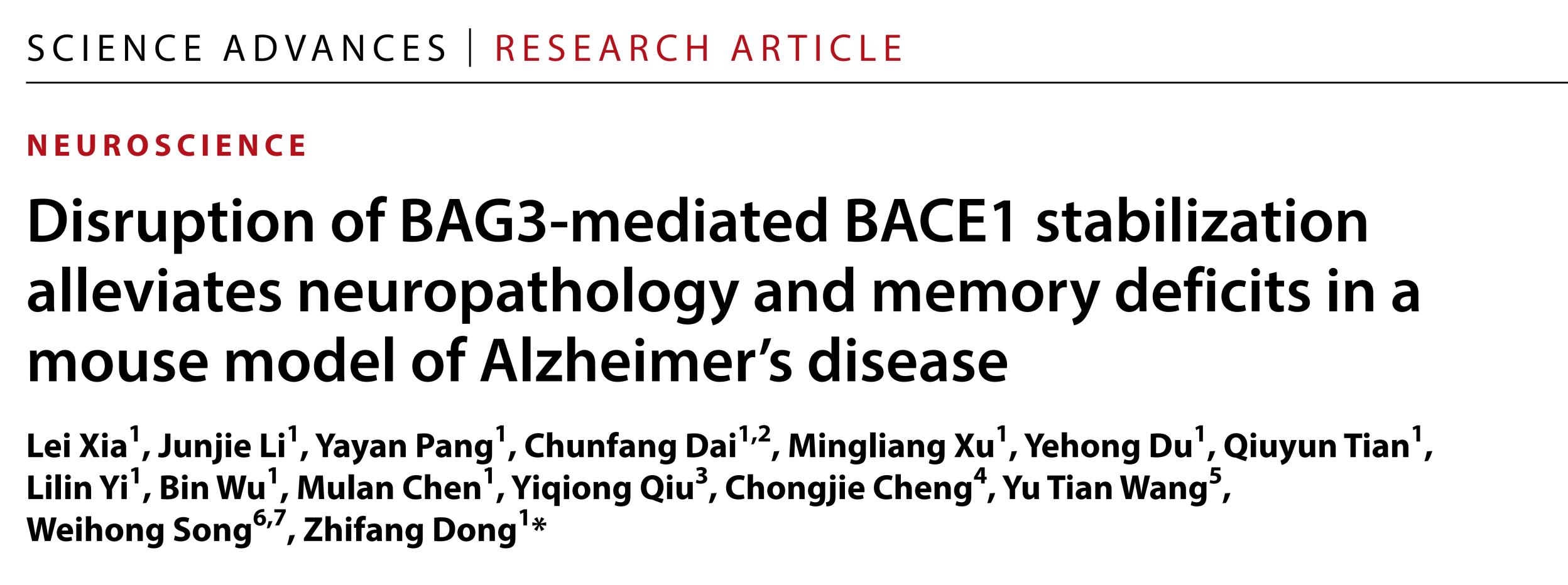 5月23日,8868官方注册附属儿童医院董志芳教授团队在Science Advances发表了题为Disruption of BAG3-mediated BACE1 stabilization alleviates neuropathology and memory deficits in a mouse model of Alzheimer's disease的研究论文。