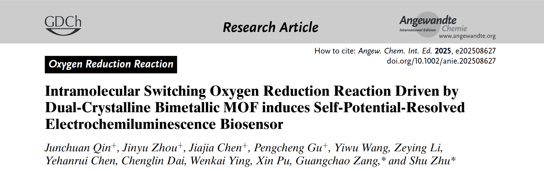 近日,我校第一临床学院本科生秦骏川(2021级临床医学五年制)、周锦域(2024级临床医学五年制)、陈佳佳(2022级临床医学五年制)在实验教学管理中心朱姝、臧广超教师团队的指导下,成功通过设计双晶相的双金属MOF,开创性地将ORR催化活性与ECL信号耦合,设计了一种新型具有分子内自催化功能的发光材料,实现了对生物分子疾病标志物的超灵敏检测,在国际权威期刊Angewandte Chemie International Edition杂志在线发表以Intramolecular Switching Oxygen Reduction Reaction Driven by Dual-crystalline Bimetallic MOF induces Self-Potential-Resolved Electrochemiluminescence biosensor为题的研究型论文。