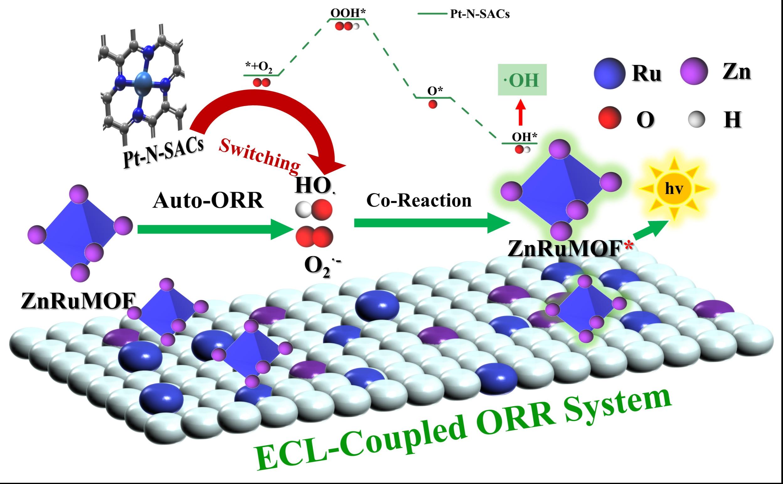 在本研究中,研究团队设计了一种具有自催化调节功能的电化学发光体——ZnRuMOF,通过不同晶相的催化能力不同,实现了对ORR催化活性的调控,从而精确调节ECL信号的强度和稳定性。研究发现,MOF结构中的双金属节点作为分子内催化的关键,不仅有效促进ORR反应,还能缩短生成的ROS与发光体之间的距离,从而大幅提升ECL信号的强度与稳定性。此外,Pt-N-SACs和DCHA核酸信号放大的整合实现了对生物分子疾病标志物的超灵敏检测。该研究突破性的解决了多个化学功能在同一分子体系内集成的研究挑战,为复杂纳米结构的精准设计、可控功能化、精准调控以及绿色高效生物传感的设计提供了新的解决方案。