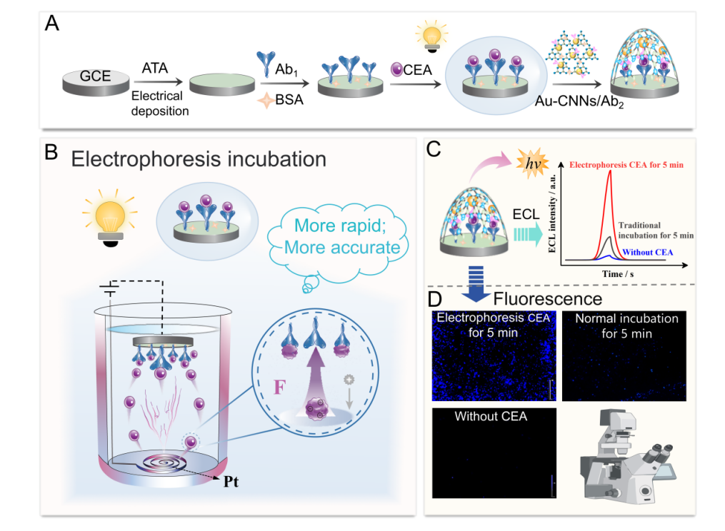 电化学发光(ECL)免疫传感是临床生物标志物高灵敏检测关键技术。本研究针对ECL免疫传感器存在的蛋白孵育耗时长、检测效率低下的问题,开创性提出电场力驱动蛋白分子定向富集机制。通过构建电泳耦合ECL系统,利用癌胚抗原(CEA)在特定缓冲环境中的负电特性,施加定向电场使目标分子如同搭上“定向快车”,能被精准迅速迁移至工作电极表面,革新传统被动扩散模式。该技术将关键抗原孵育时间大幅缩短至5分钟,极大提升检测效率。