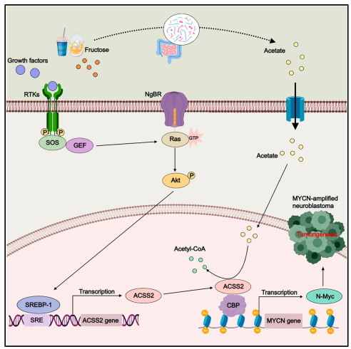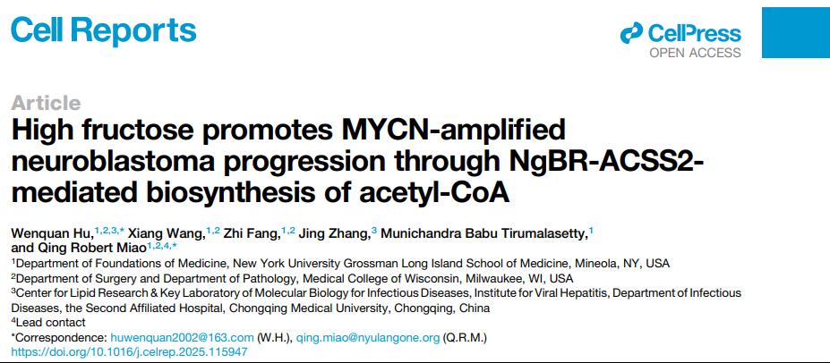 2025年7月3日,我校胡文全教授团队与纽约大学缪清课题组在国际知名学术期刊Cell Reports上发表了题为“High fructose promotes MYCN-amplified neuroblastoma progression through NgBR-ACSS2-mediated biosynthesis of acetyl-CoA”的研究论文,揭示了ACSS2通过调控组蛋白乙酰化修饰抑制MYCN多拷贝的神经母细胞瘤的恶性增殖的分子机制。肿瘤的发生还依赖于细胞代谢的重编程,这一过程会显著影响表观遗传和转录组的调控。