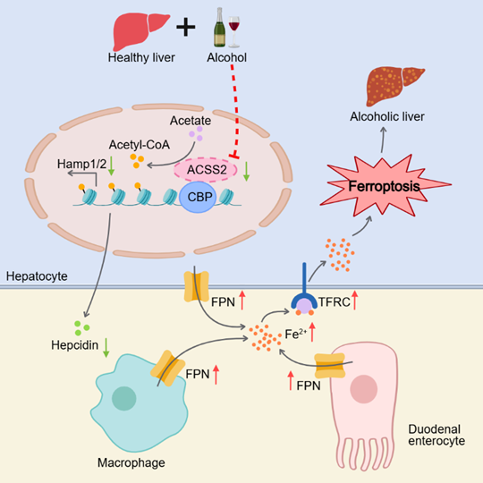 综上所述,本研究揭示了ACSS2在ALD发病机制中的关键作用,即ACSS2通过CBP介导的组蛋白乙酰化调控HAMP1/2表达,从而维持铁稳态并抑制肝细胞铁死亡。这一发现不仅阐明了ALD中铁超载的分子机制,更提出了靶向ACSS2-HAMP轴的治疗新策略。