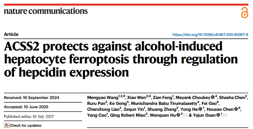 2025年7月1日,我校胡文全教授团队和中国科学技术大学段亚君教授团队在国际知名学术期刊Nature Communications上发表了题为“ACSS2 protects against alcohol-induced hepatocyte ferroptosis through regulation of hepcidin expression”的研究论文,使用多组学联合分析,揭示了ACSS2通过代谢-表观遗传修饰途径交叉调节全身铁代谢,从而抵抗酒精诱导的肝细胞铁死亡。本研究首先通过结合临床样本和GEO数据库,发现ALD患者血清乙酸水平显著升高,且ACSS2主要富集于肝实质细胞中。酒精处理可剂量依赖性降低AML12、HepG2细胞和原代肝细胞中ACSS2表达,人类和小鼠ALD样本显示酒精摄入后ACSS2水平降低。利用基因编辑技术构建的ACSS2敲除小鼠模型显示,乙醇喂养后,ACSS2缺失加剧肝损伤、炎症反应。相反,ACSS2过表达减轻酒精诱导的不良反应。