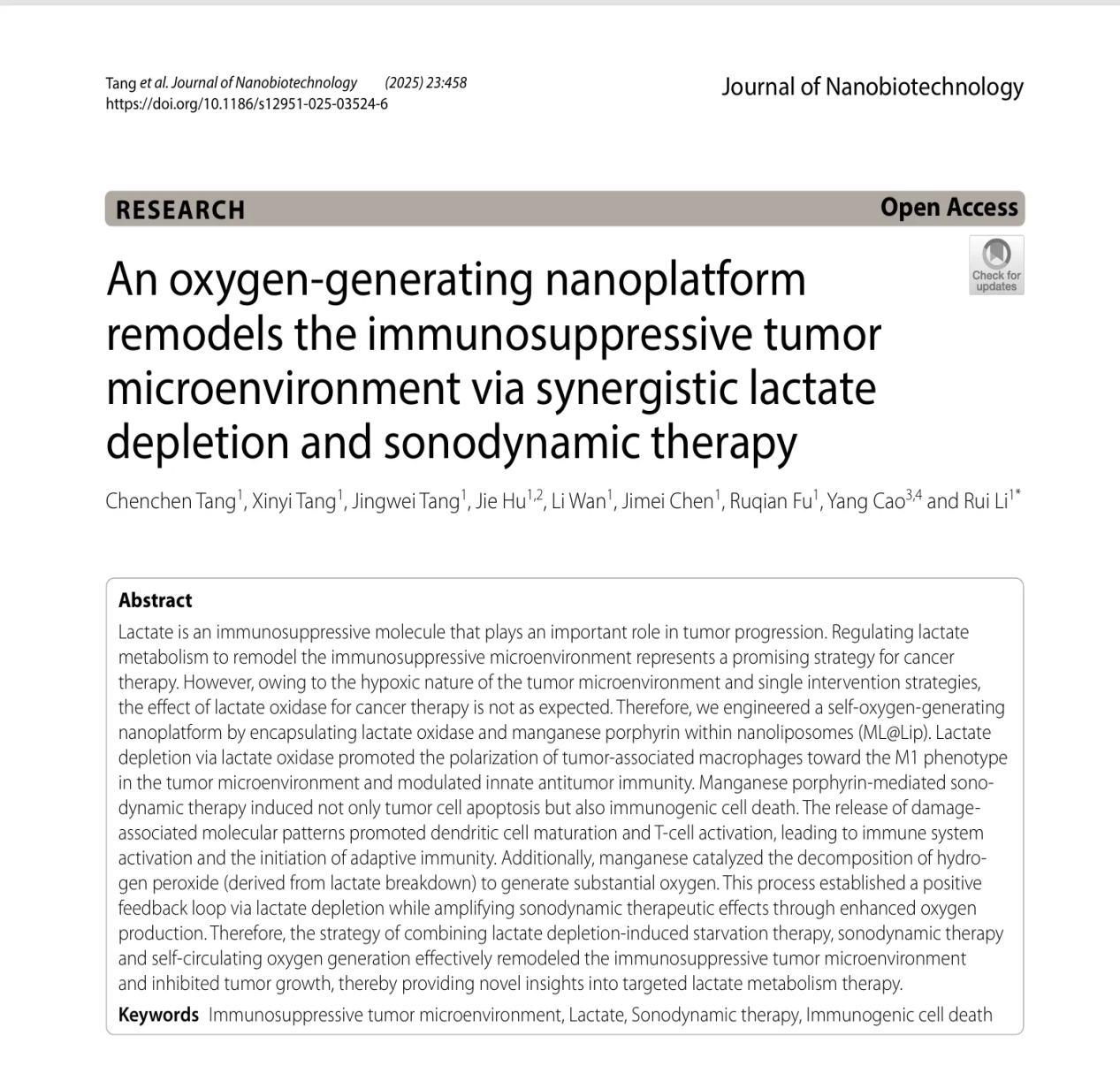 近日,附属第三医院超声科李锐团队在国际顶级学术期刊Journal of Nanobiotechnology发表文章“An oxygen-generating nanoplatform remodels the immunosuppressive tumor microenvironment via synergistic lactate depletion and sonodynamic therapy”。该研究针对肿瘤治疗中免疫抑制微环境这一普遍难题,通过乳酸消耗和声动力治疗的双重手段,并巧妙利用肿瘤微环境设计自循环产氧策略,有效地重塑了肿瘤免疫抑制微环境并抑制了肿瘤生长,从而为肿瘤治疗提供了新的见解。