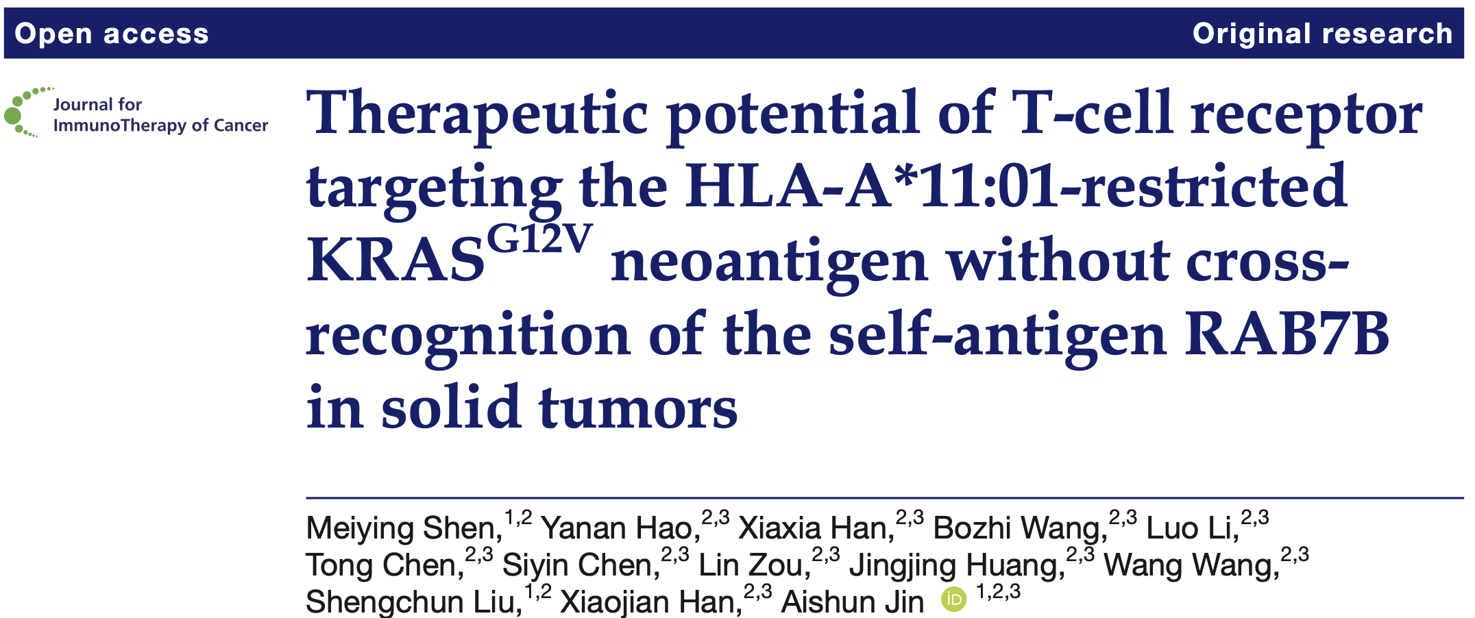 近日,我校基础医学院金艾顺教授联合附一院刘胜春教授团队,在JITC期刊上发表了题为Therapeutic potential of T cell receptor targeting the HLA-A*11:01-restricted KRASG12Vneoantigen without cross-recognition of the self-antigen RAB7B in solid tumors的研究论文。